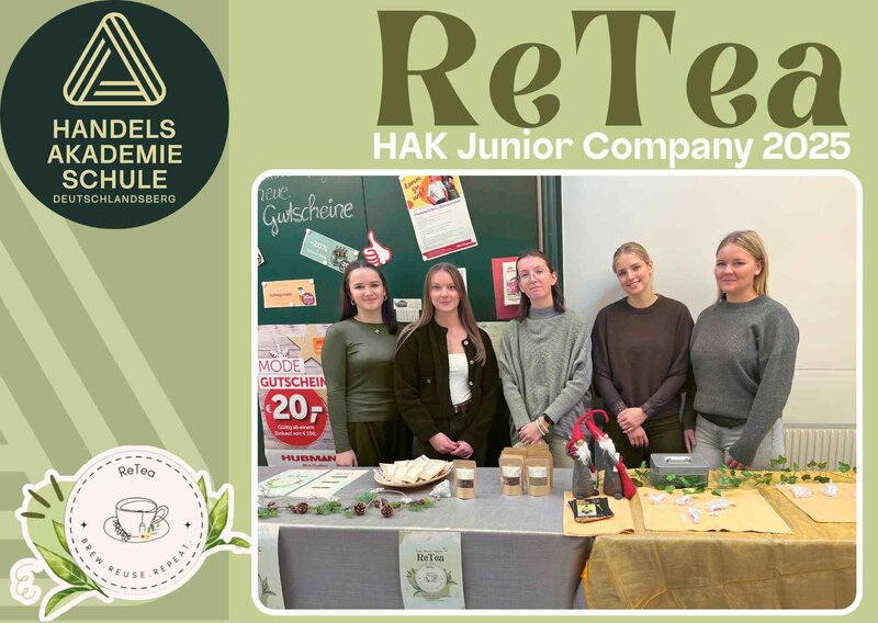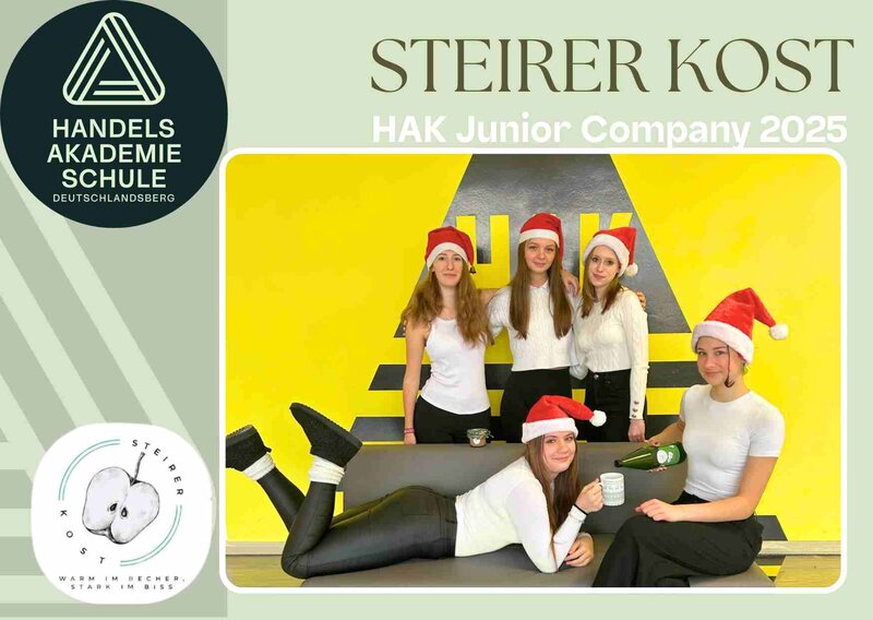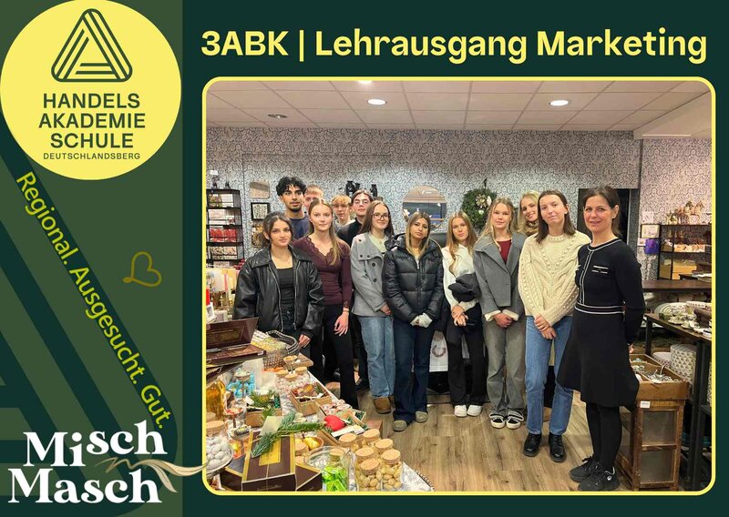Ausbildungsschwerpunkt Marketing im MischMasch Am 2. Dezember 2025 besuchte der Ausbildungsschwerpunkt 'Marketing' das MischMasch in Deutschlandsberg. Weiterlesen Willkommen an der BHAK/BHAS Deutschlandsberg Wir freuen uns, eine italienische Schulklasse im Rahmen von Erasmus+ bei uns zu begrüßen. Weiterlesen Teamarbeit mit dem Fröbelturm Die Peers der 2AS, Muhittin, Ahmad, Christin und Lennox führten mit der 1AS eine Übung zur Teamarbeit durch, nämlich den Fröbelturm. Weiterlesen Junior Company ReTea – Brew · Reuse · Repeat Unsere Unternehmensidee: Nachhaltigkeit und bewusster Teegenuss sollen Hand in Hand gehen. Wir bieten unseren Kunden:innen zwei Produktbereiche: Weiterlesen Wärmender Genuss aus der Junior Company „Steirer Kost" Mit den ersten frostigen Tagen steigt die Lust auf etwas Warmes. Das ist genau der richtige Zeitpunkt für die Junior Company der BHAK… Weiterlesen Einstimmung in den Advent Gute Tradition in unserem Schulzentrum hat die Adventkranzsegnung am Beginn des Advents. Vertreter der Klassen, der Lehrpersonen und die… Weiterlesen Kreative Jungunternehmer setzen auf nachhaltiges Design Jungunternehmer der BHAK Deutschlandsberg verwandeln recycelte Rennreifen in stilvolle Möbelstücke und setzen damit ein starkes Zeichen für… Weiterlesen Business Brunch Am 21. November 2025 fand der Business Brunch 25/26 für die ersten Klassen statt. Gemeinsam mit den Unternehmenspartnern – der Steuerberatung Haydn,… Weiterlesen Mehr News anzeigen weiter zum Newsarchiv