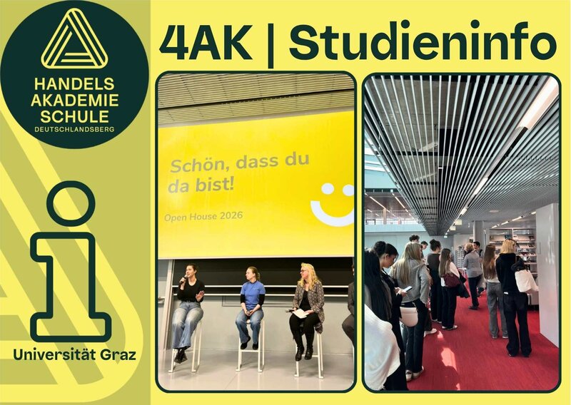Ausflug nach Graz ins WOOP Die 1BK verbrachte am 16.04.2026 einen sportlichen Vormittag im WOOP-Freizeitpark in Graz. Weiterlesen Erasmus-Plus-Besuch aus Bremen am BSZ Deutschlandsberg Im Rahmen eines Erasmus-Plus-Projektes durften die berufsbildenden höheren und mittleren Schulen des BSZ Deutschlandsberg am Mittwoch, dem 15. April,… Weiterlesen 4AK auf der Uni Graz Die 4AK nahm am Tag der offenen Tür der Universität Graz teil. Es war eine tolle Gelegenheit, um viele Informationen rund ums Studieren an der… Weiterlesen Österreichischer Vorlesetag – HAK Deutschlandsberg im Kindergarten Erlenweg Am 26. März 2026 besuchten einige Schülerinnen und Schüler der 1AK im Rahmen des österreichischen Vorlesetages den Kindergarten Erlenweg in… Weiterlesen 37. Quiz Politische Bildung Die Veranstaltung fand im Landhaus in Graz statt. Die HAK/HAS Deutschlandsberg durfte mit zwei Teilnehmern der HAS (Paul Slabernig 1AS und Valentin… Weiterlesen Steirerkost auf der Gründermesse Das Junior Team Steirerkost war bei der Gründermesse 2026 dabei und durfte dort seine Produkte präsentieren. Dabei wurden wertvolle Kontakte geknüpft… Weiterlesen 4AK in Wien Die Schüler:innen der 4AK konnten für einige Stunden in den Alltag an der Wirtschaftsuniversität Wien eintauchen. Weiterlesen Teaching Assistants Auch in diesem Schuljahr unterstützen wieder zwei Sprachassistent:innen den Unterricht in Englisch und Italienisch an unserer Schule. Sie begleiten… Weiterlesen Mehr News anzeigen weiter zum Newsarchiv