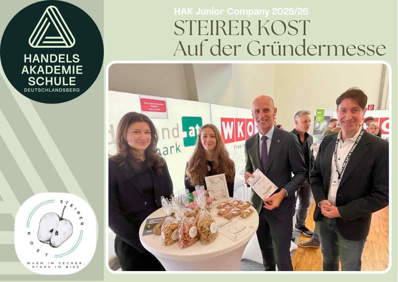 Steirerkost auf der Gründermesse Das Junior Team Steirerkost war bei der Gründermesse 2026 dabei und durfte dort seine Produkte präsentieren. Dabei wurden wertvolle Kontakte geknüpft… Weiterlesen 4AK in Wien Die Schüler:innen der 4AK konnten für einige Stunden in den Alltag an der Wirtschaftsuniversität Wien eintauchen. Weiterlesen Teaching Assistants Auch in diesem Schuljahr unterstützen wieder zwei Sprachassistent:innen den Unterricht in Englisch und Italienisch an unserer Schule. Sie begleiten… Weiterlesen Antenne Snowday 2026 Am 5. März 2026 nahmen rund 40 Schüler:innen der BHAK/BHAS Deutschlandsberg am Antenne Snowday auf der Planai teil. Weiterlesen 4AK entdeckt die Welt des Debattierens Die Schüler:innen der 4AK der BHAK/BHAS Deutschlandsberg nahmen am Montag, den 2. März, an einem spannenden Debattierworkshop teil, der von Katrin… Weiterlesen Die 4AK diskutiert über die Zukunft Europas Am Freitag, dem 27.02.2026, fand im BSZ Deutschlandsberg eine Dialogveranstaltung zum Thema Europa und Europäische Union statt, bei der auch die… Weiterlesen Pitch-Training der 3ABK Die 3AK und die 3BK absolvierten ein Pitchtraining mit Studierenden der FH Campus02 - Studiengang Innovationsmanagement. Weiterlesen Youth Entrepreneurship Week Vom 23. bis 26. Februar 2026 nahm die 2ABK der HAK/HAS Deutschlandsberg an der Youth Entrepreneurship Week im JUFA Hotel Deutschlandsberg teil. Weiterlesen Mehr News anzeigen weiter zum Newsarchiv