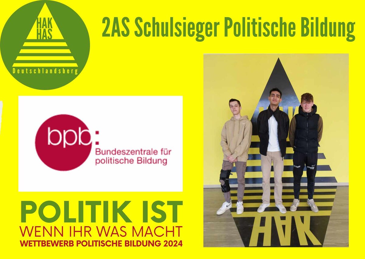 Quiz Politische Bildung – Die Schulsieger 2024 der HAK und HAS Die Gewinner sind: Thorsten Krauss, Max Schauer und Patrick Rexeis – alle aus der 4BK. Die Schulsieger der HAS Deutschlandsberg beim Quiz Politische Bildung sind: Christof Hartinger, Dominik Muchitsch und Mohamad Morsel. Sie alle werden die Schule beim Landeswettbewerb 2024 super vertreten. Zurück