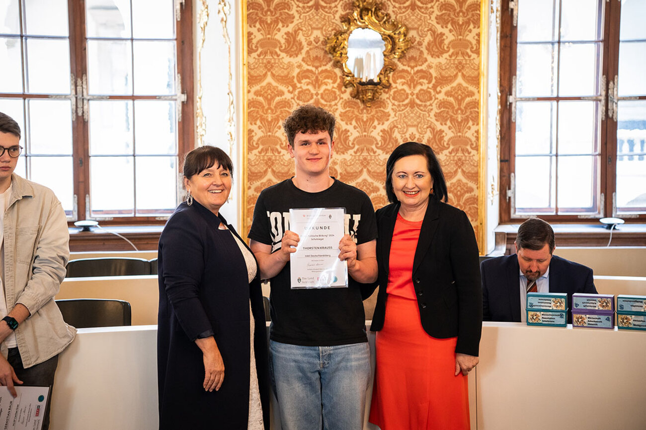 Die Erstplatzierten unserer schulinternen Ausscheidung, Thorsten Krauss (HAK) und Christof Hartinger (HAS), bekamen von Frau Bildungsdirektorin HR Elisabeth Meixner und von Frau Landtagspräsidentin Manuela Khom Urkunden überreicht.