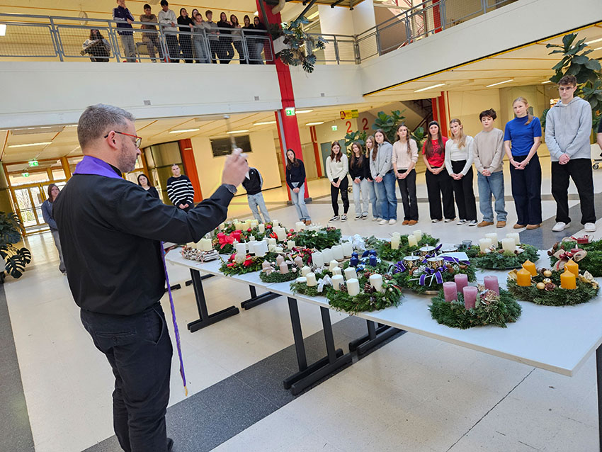 Gute Tradition in unserem Schulzentrum hat die Adventkranzsegnung am Beginn des Advents. Vertreter der Klassen, der Lehrpersonen und die Direktor:innen kamen gemeinsam in der Aula zusammen, um die Adventkränze in den Klassen und Konferenzzimmern segnen zu lassen.