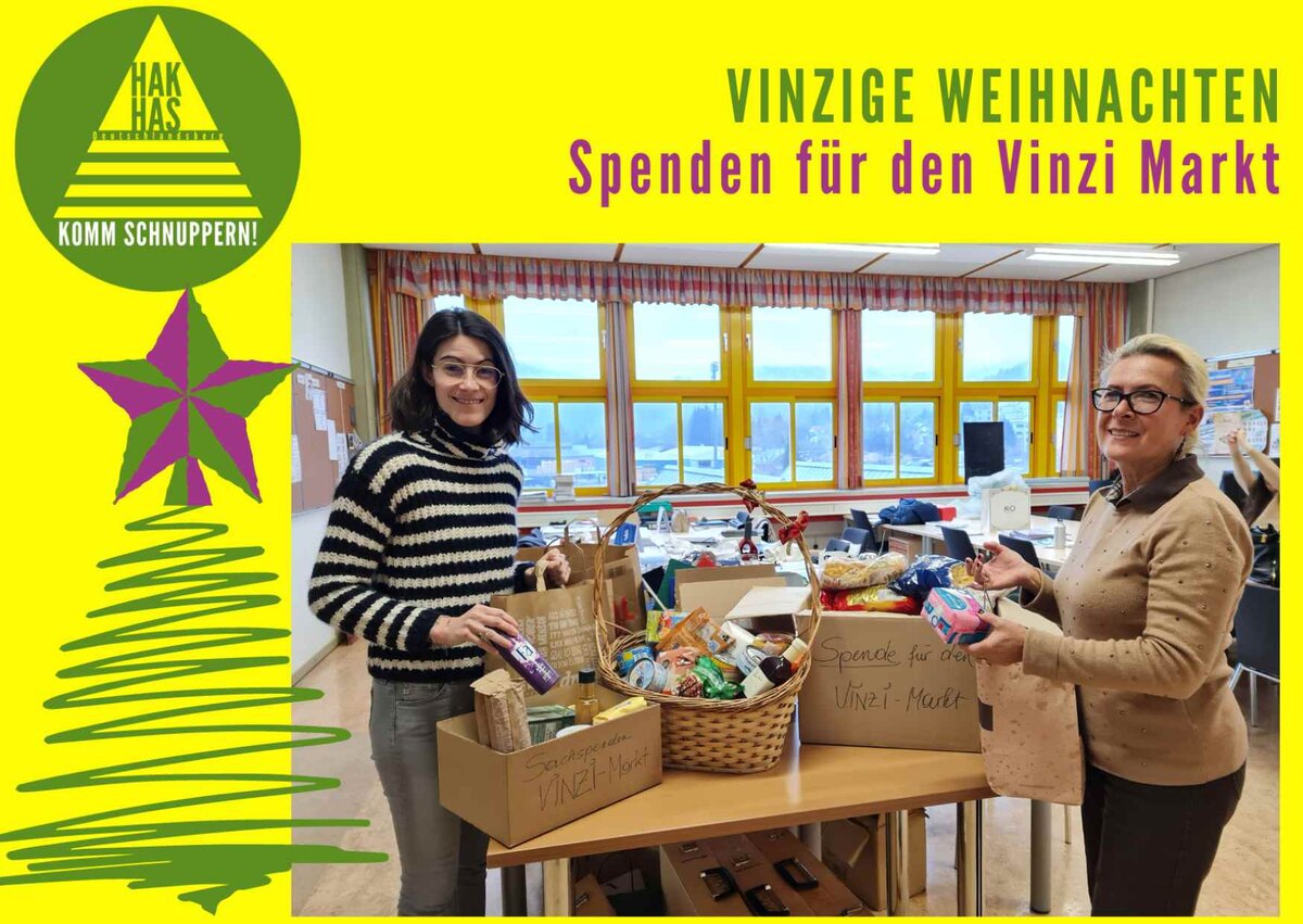 Vinzige Weihnachten Auch 2022 haben die Lehrer:innen der HAK/HAS Deutschlandsberg wieder ihre Vinzi-Spenden-Aktion durchgeführt. Viele wertvolle Lebensmittel und Hygieneartikel wurden gespendet und werden das Angebot des Vinzi Markts Deutschlandsberg unterstützen. Zurück
